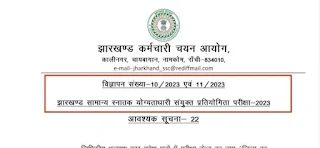 झारखंड कर्मचारी चयन आयोग JSSC द्वारा सामान्य स्नातक योग्यताधारी संयुक्त प्रतियोगिता परीक्षा 2023 की परीक्षा 21 सितंबर 2024 दिन शनिवार और 22 सितंबर 2024 दिन रविवार को दो दिन चार पालियों में राज्य के विभिन्न परीक्षा केंद्र पर आयोजित होगी। इस परीक्षा में शामिल होने वाले अभ्यर्थियों को एडमिट कार्ड जारी होने का इंतजार था अब झारखंड कर्मचारी चयन आयोग द्वारा एडमिट कार्ड जारी कर दिया गया है। इससे पहले एडमिट कार्ड जारी होने के संबंध में नई सूचना जारी की गई थी JSSC द्वारा जारी सूचना के अनुसार झारखंड सामान्य स्नातक योग्यता धारी संयुक्त प्रतियोगिता परीक्षा 2023 नियमित एवं बैकलॉग जिसका आयोजन दिनांक 21 सितंबर दिन शनिवार और 22 सितंबर 2024 दिन रविवार को आयोजन होना निर्धारित है का प्रवेश पत्र दिनांक 17 सितंबर 2024 से झारखंड कर्मचारी चयन आयोग JSSC की आधिकारिक वेबसाइट से डाउनलोड किया जा सकेगा। परीक्षा तिथि मे अभी कोई बदलाव नहीं किया गया है। परीक्षा निर्धारित तिथि और समय पर आयोजित होगी।